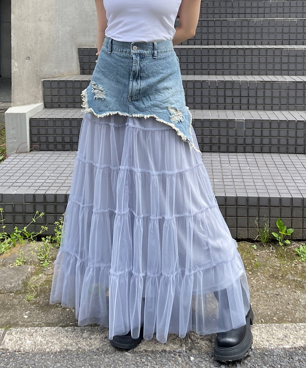 デニムとチュールを組み合わせた、異素材ミックスのロングスカート。
