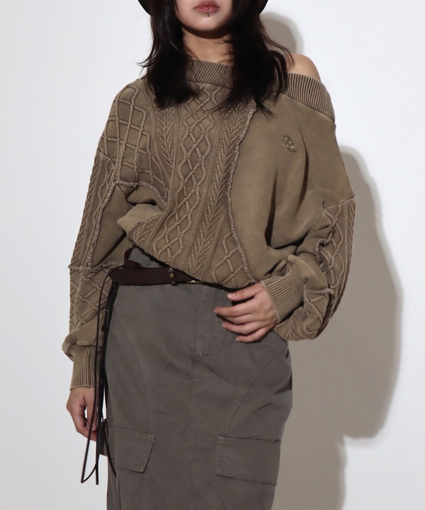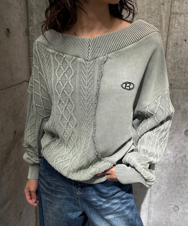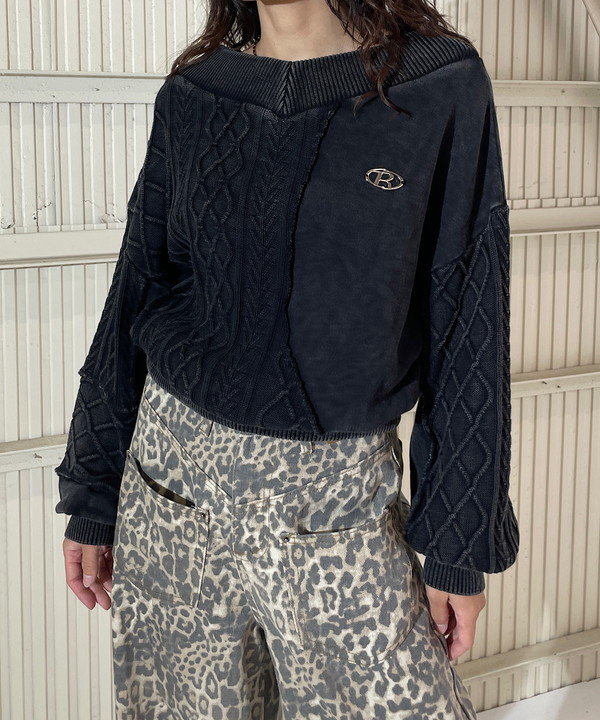 ケーブルニットがドッキングされた、ショート丈トップス。