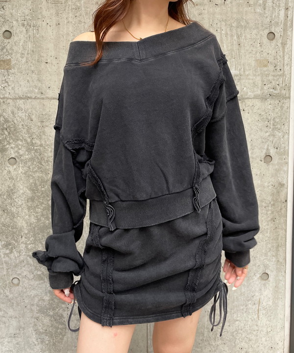 セットアップでの着用で、ロングブーツ合わせがおすすめ!